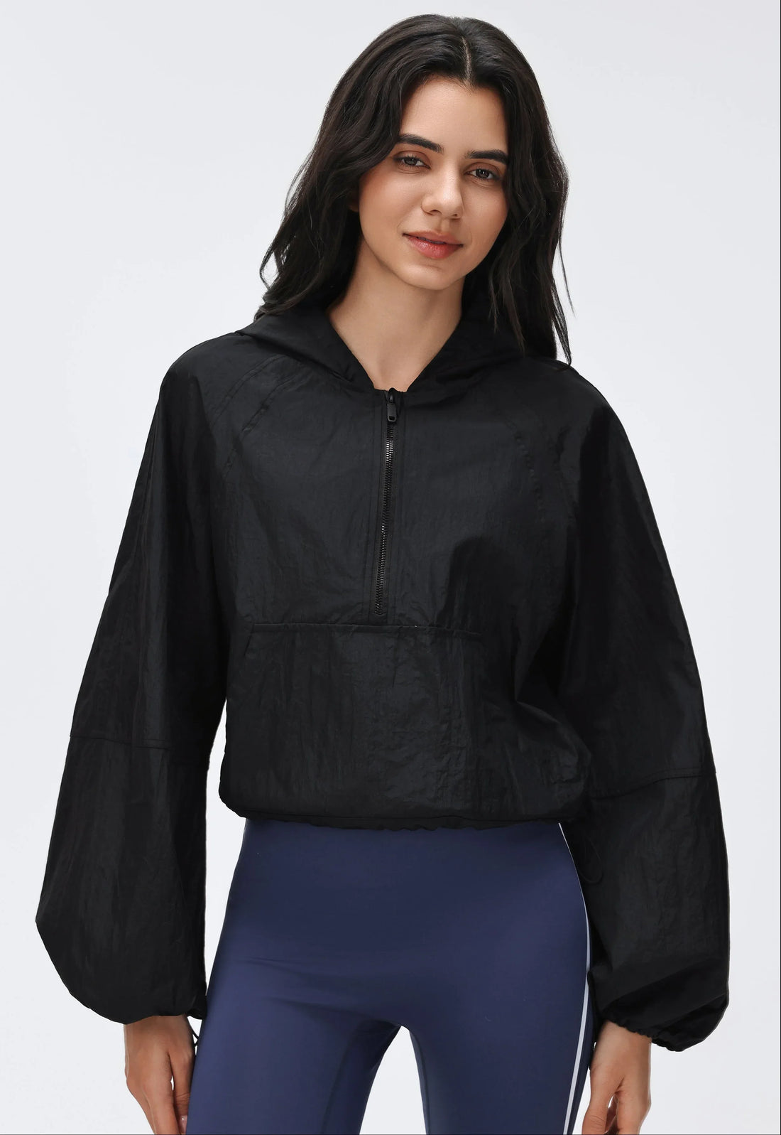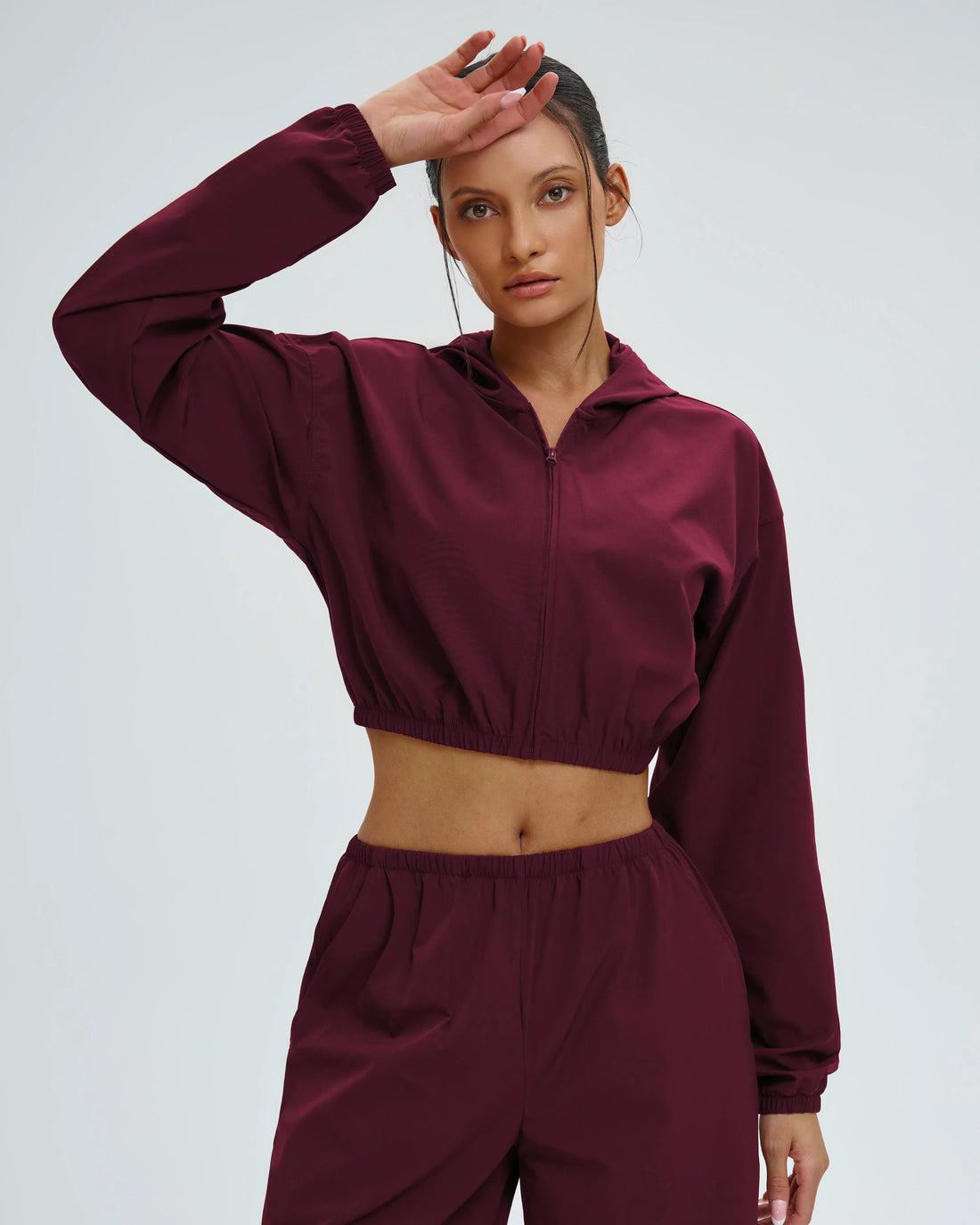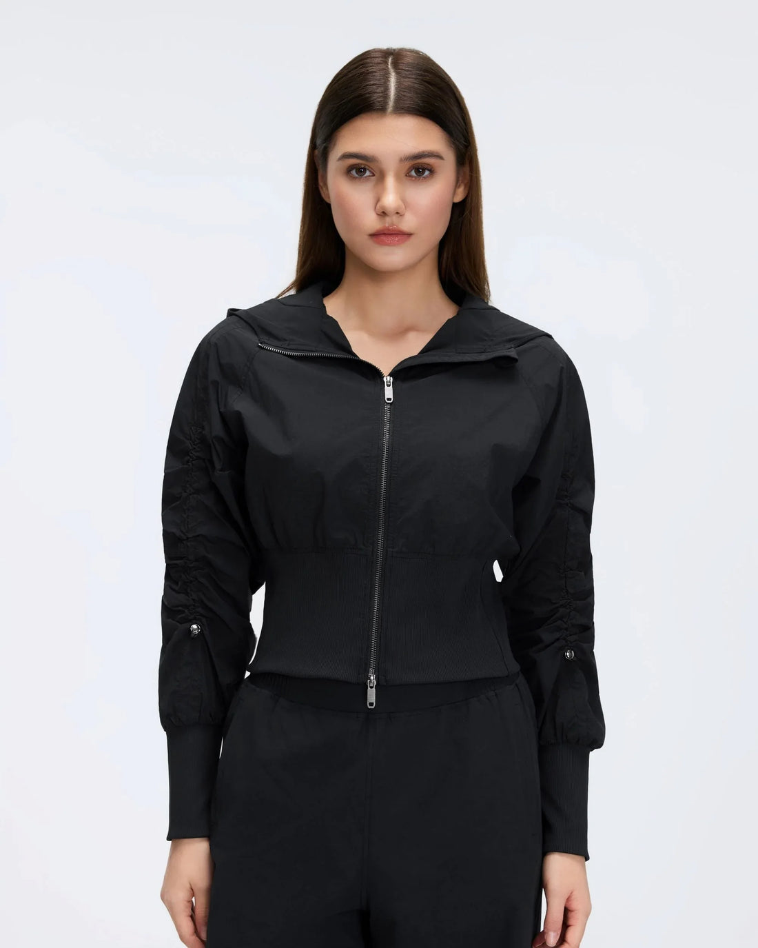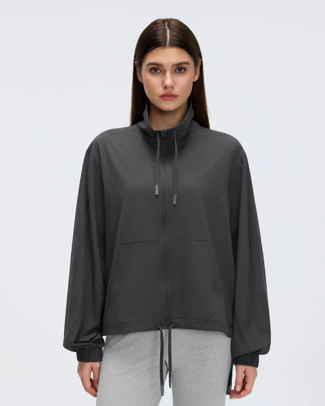 Cropped Drawstring Hooded Windbreaker A lightweight hooded jacket engineered for wind and water resistance. Features...