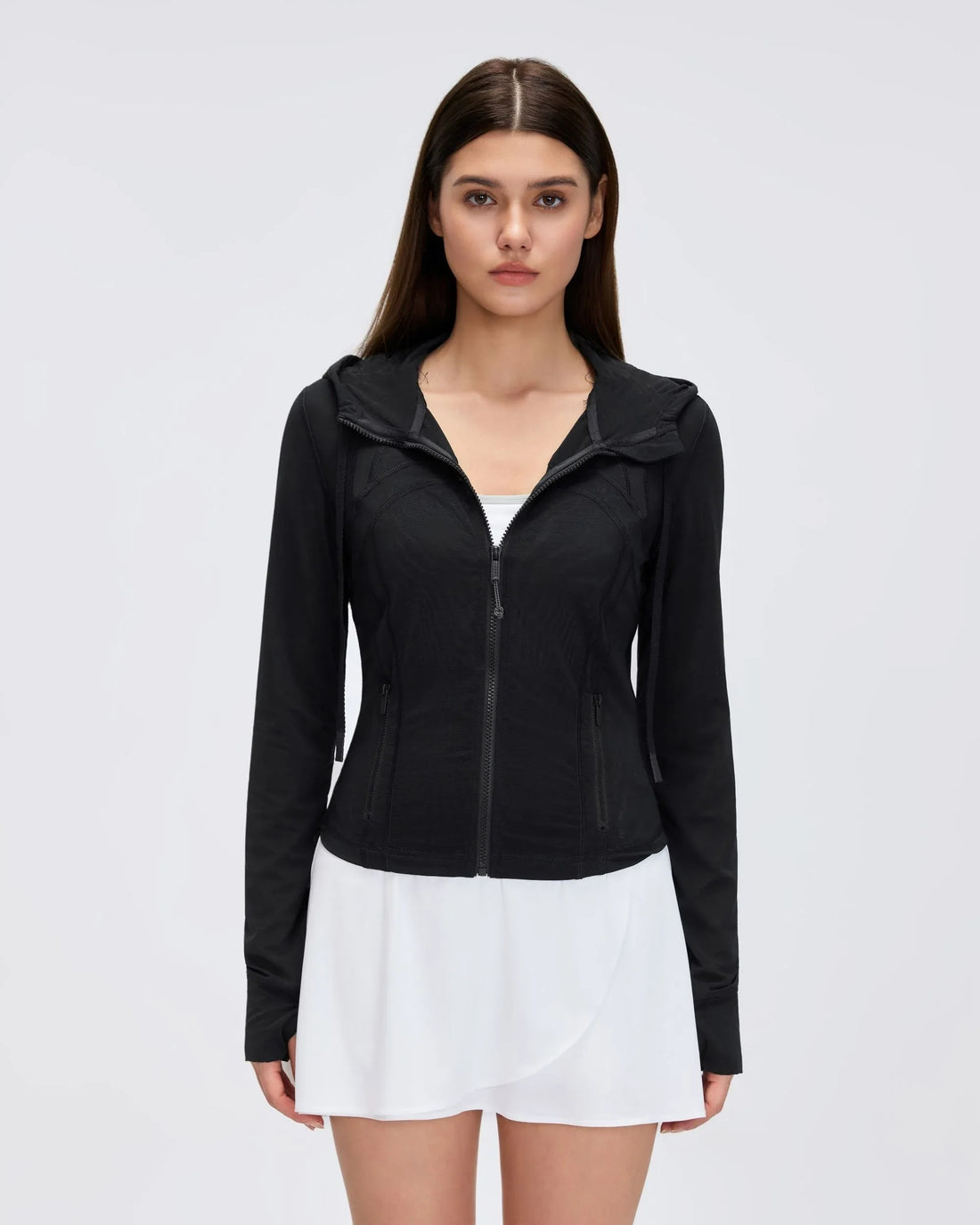 Mesh-Lined Hooded Workout Jacket This performance hoodie features a drawstring hood for neck coverage, secure...